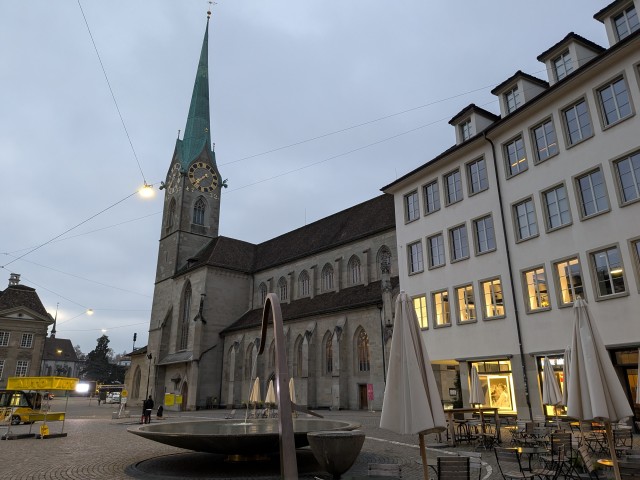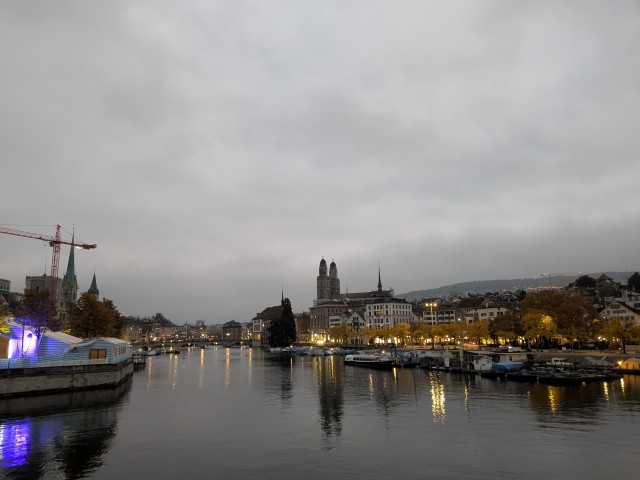 朝食を食べたあと、まだ薄暗い中、外に散歩へ。チューリッヒ湖を見ようと、ホテルから、まずは、リマト川沿いにクヴァイ橋まで行ってみる。